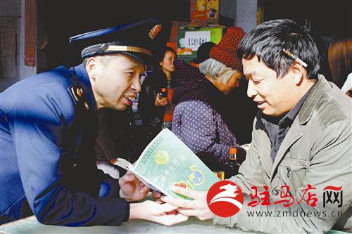 連日來,新蔡縣工商局開展送新《消費者權益保護法》“五進”活動。圖為近日該局宋崗工商所工作人員向一食品經營戶講解新《消費者權益保護法》。