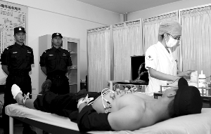 昨日,巡特警總隊(duì),急救醫(yī)生正在為剛訓(xùn)練完的特警檢查身體。通訊員 徐撼昆 攝