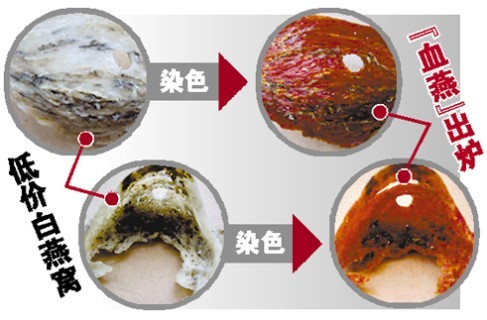 染色:將賣相不好的燕盞染成血燕盞和黃燕盞;