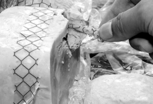 包裝膜和金屬環是在問題火腿的內部接近中心的位置,緊緊和火腿肉攪在一起,難以用手拽出。